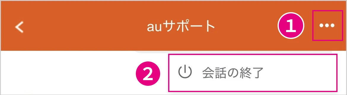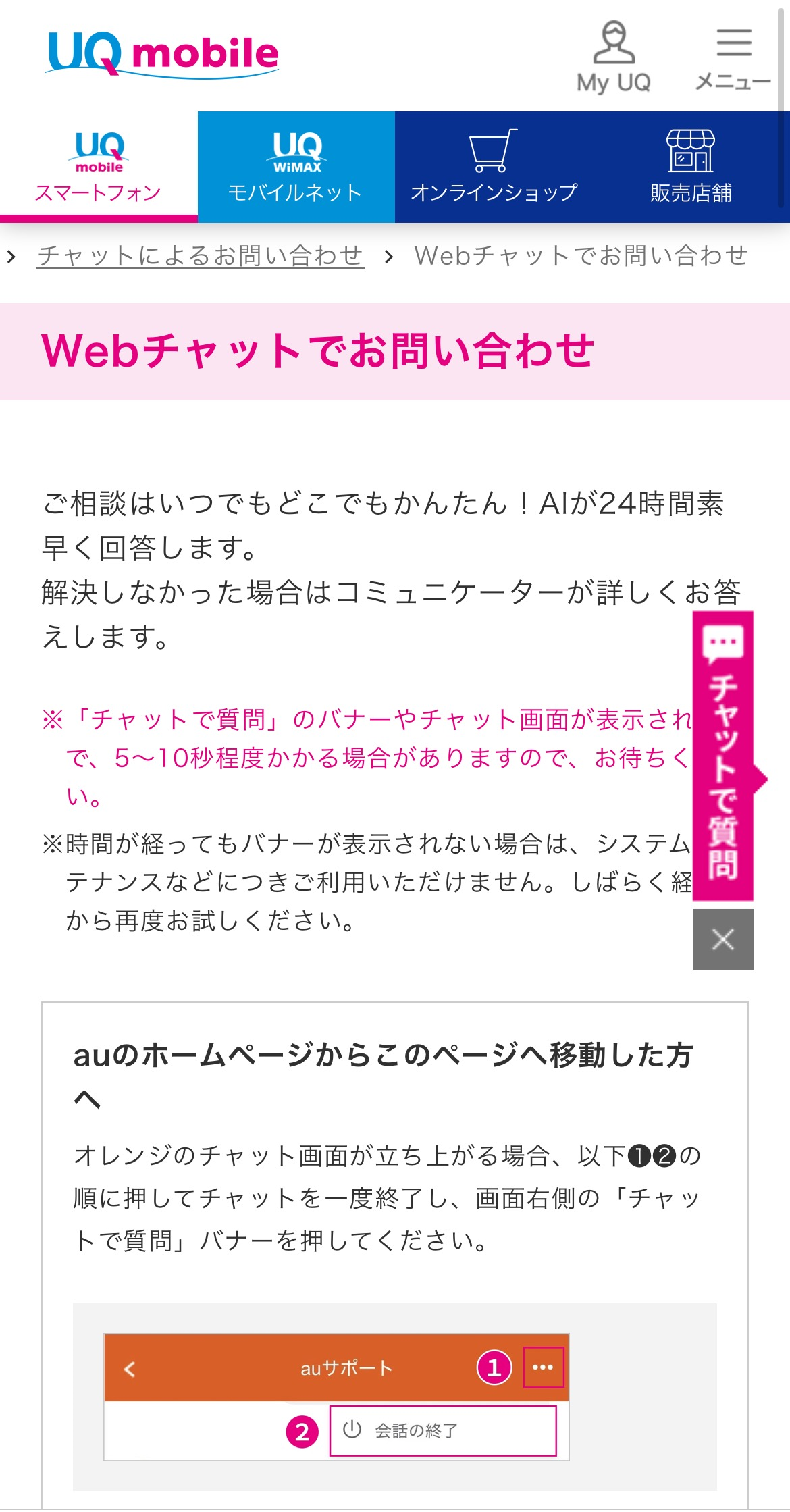 オレンジのチャット画面が立ち上がる場合、以下❶❷の順に押してチャットを一度終了し、画面右側の「チャットで質問」バナーを押してください。
