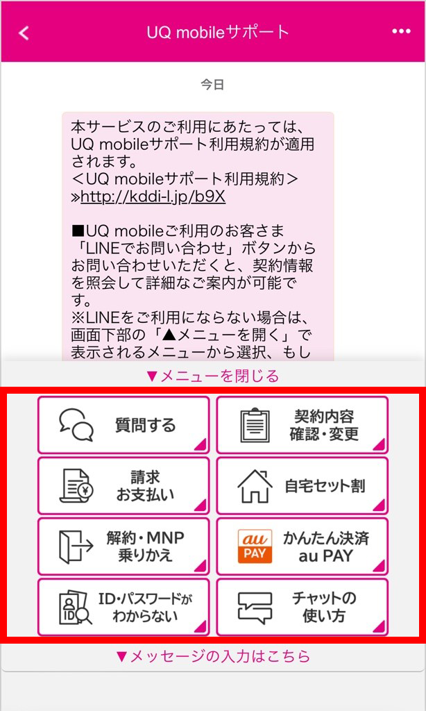 「▲メニューを開く」をタップすると選択メニューが表示され、メッセージ入力不要で質問できます。